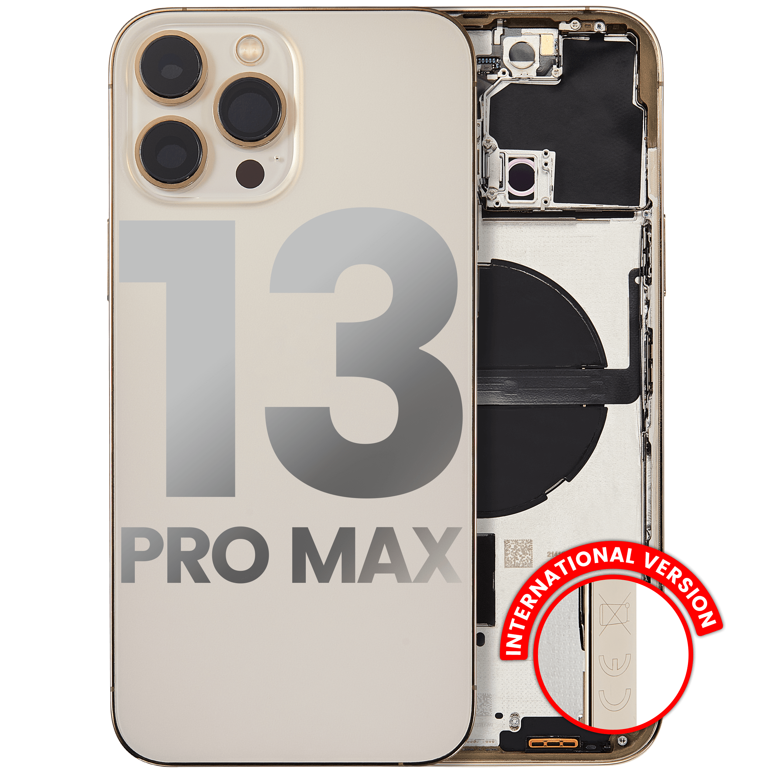 • High quality Back housing for iPhone 13 Pro Max w/ small components pre-installed (International Version) (Used OEM Pull: Grade C) (Gold).