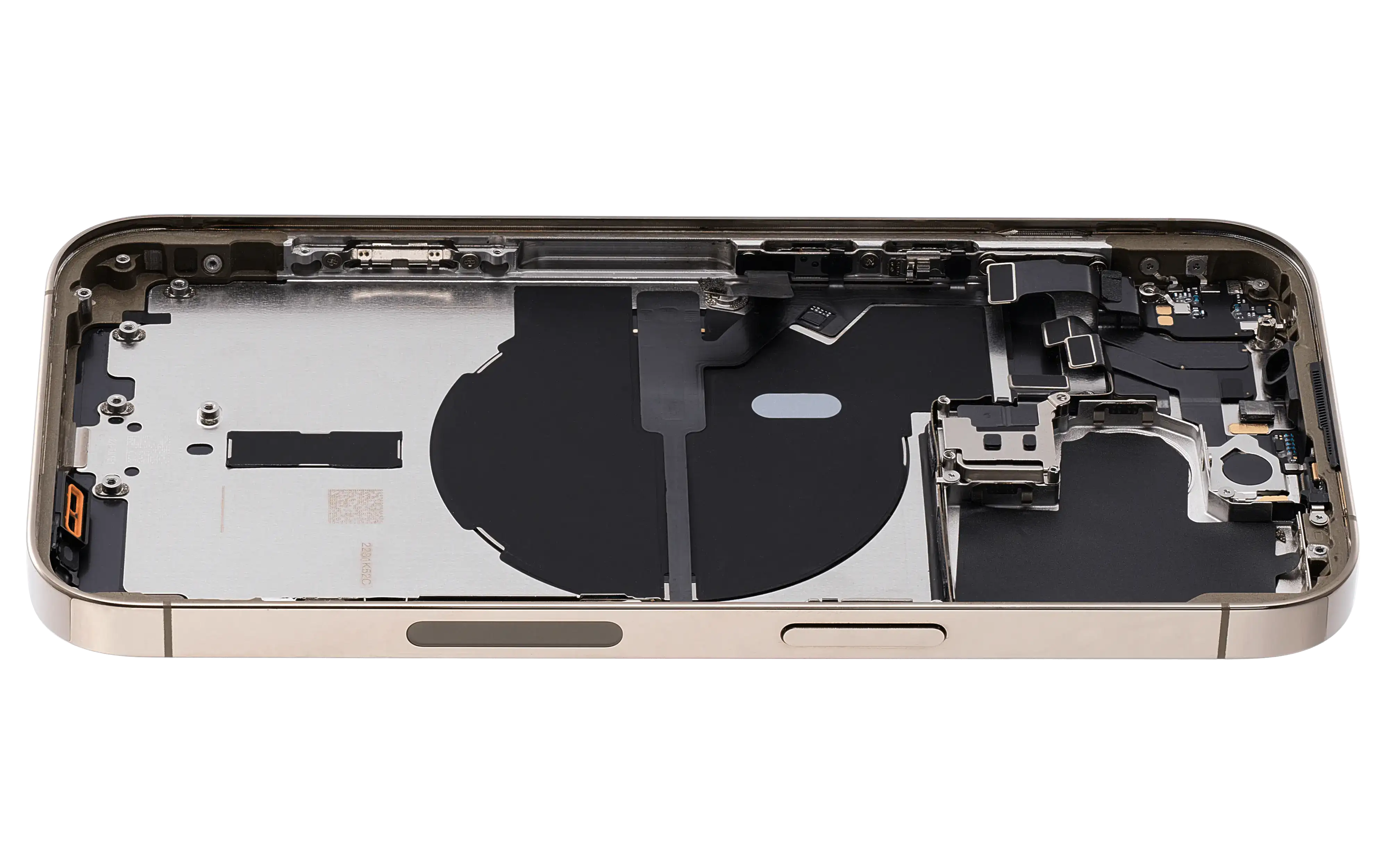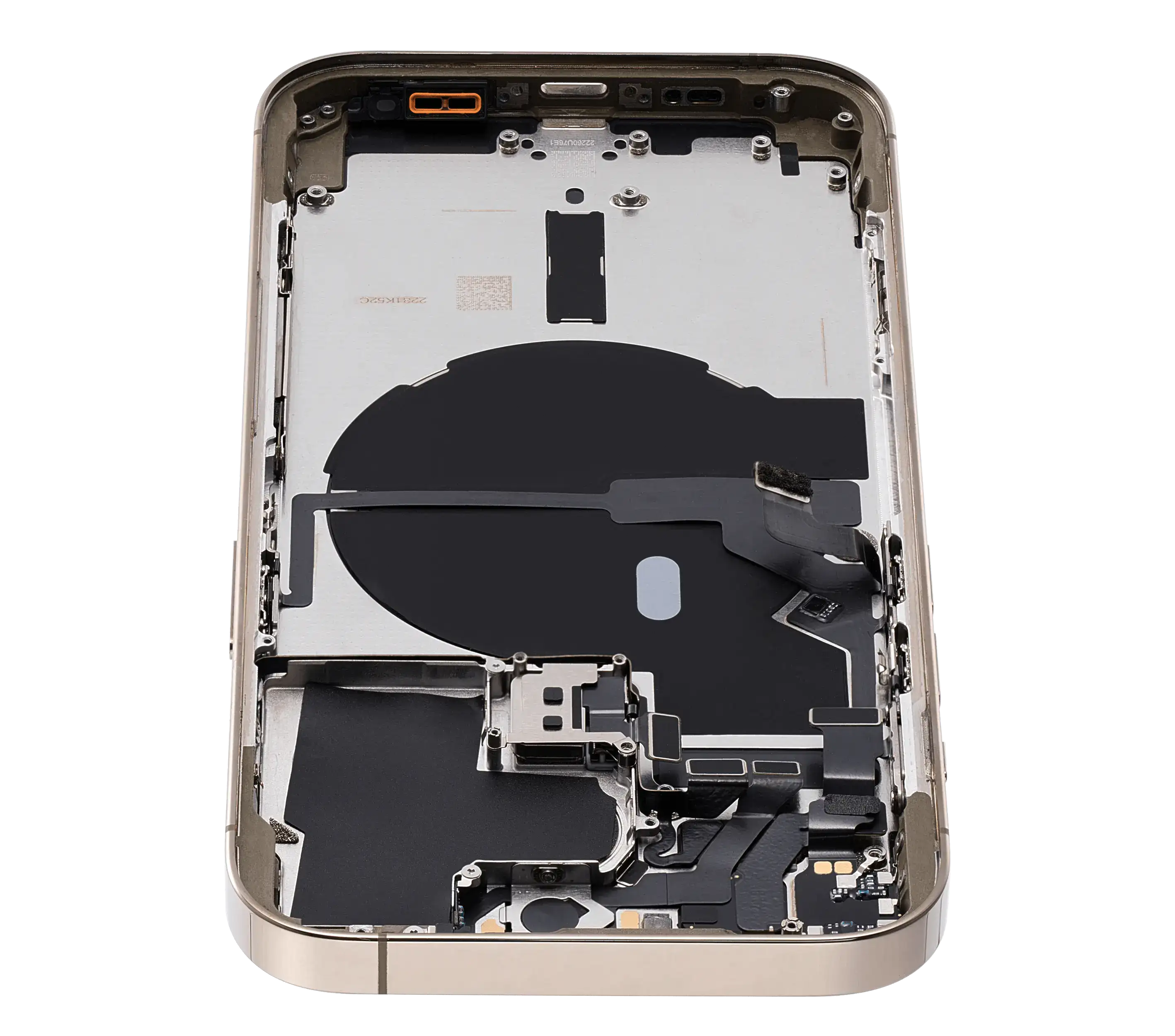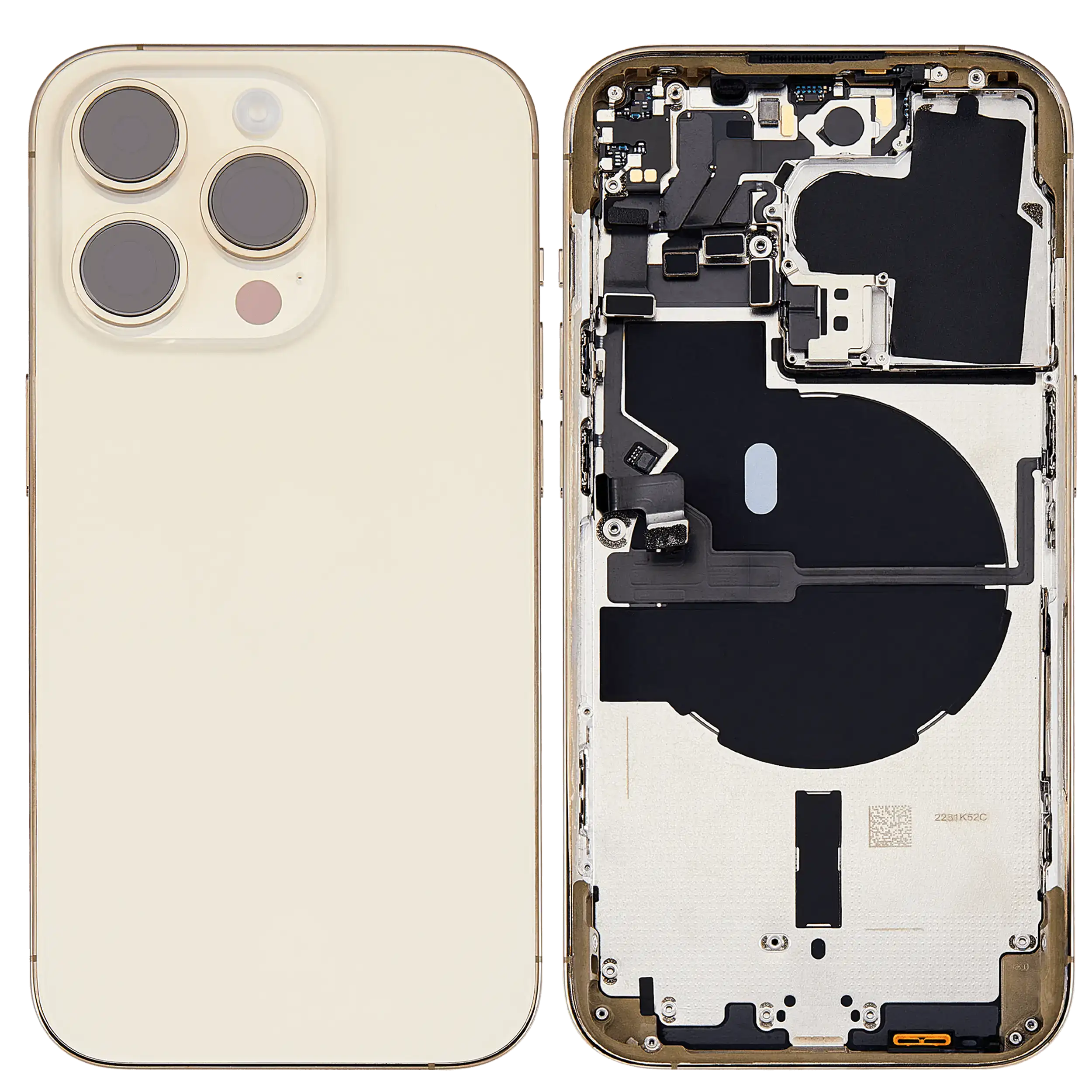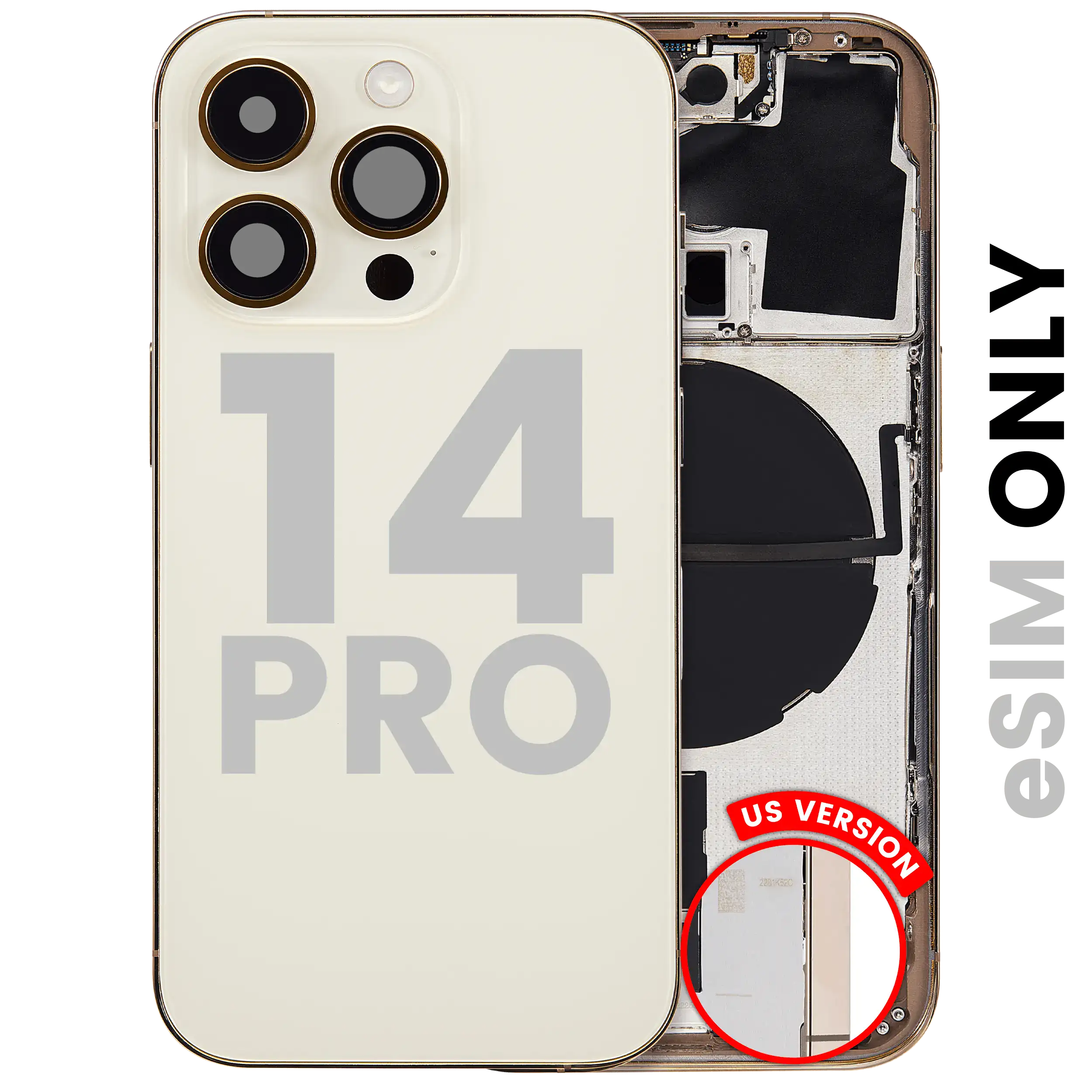 • Superb quality Back Housing W/ Small Components Pre-Installed for iPhone 14 Pro (U.S Version) (Used OEM Pull: Grade C) (Gold).